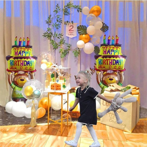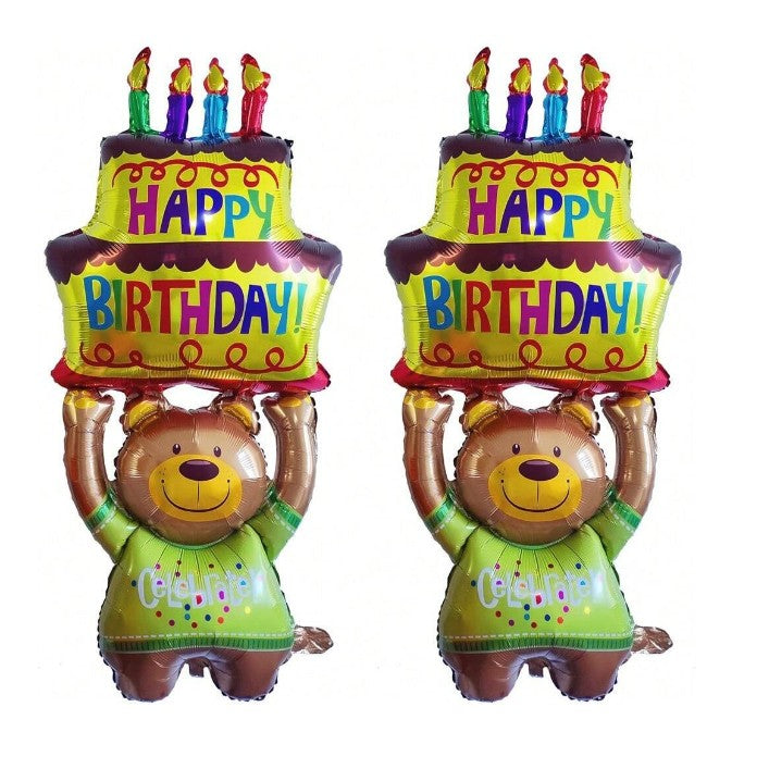 Balon din Folie Metalizata, Figurine Animalute, Model Ursulet cu Tort Aniversar,Ambalaj Individual, Pai Inclus, Umflare cu Aer sau Heliu