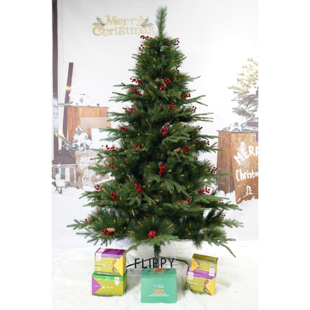 Brad artificial de Craciun, decorat cu conuri pin rosii, pentru interior/exterior, inaltime , diametru , 767 ramuri
