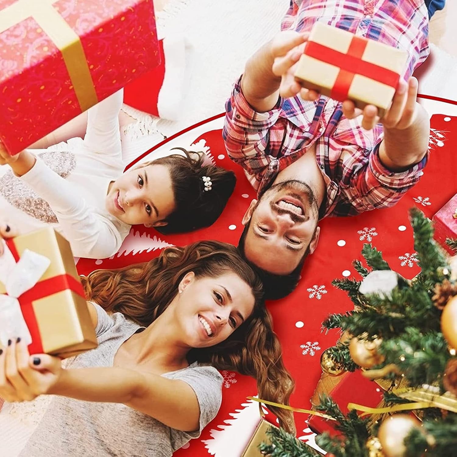 Covoras pentru Bradul de Craciun, din Tesatura Pufoasa, cu Fundite de Prindere, Model Brazi