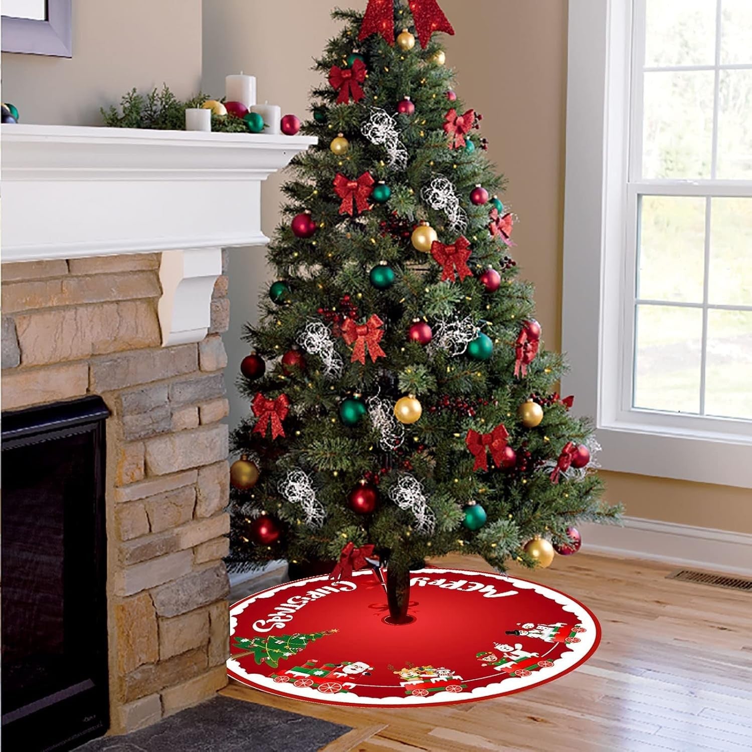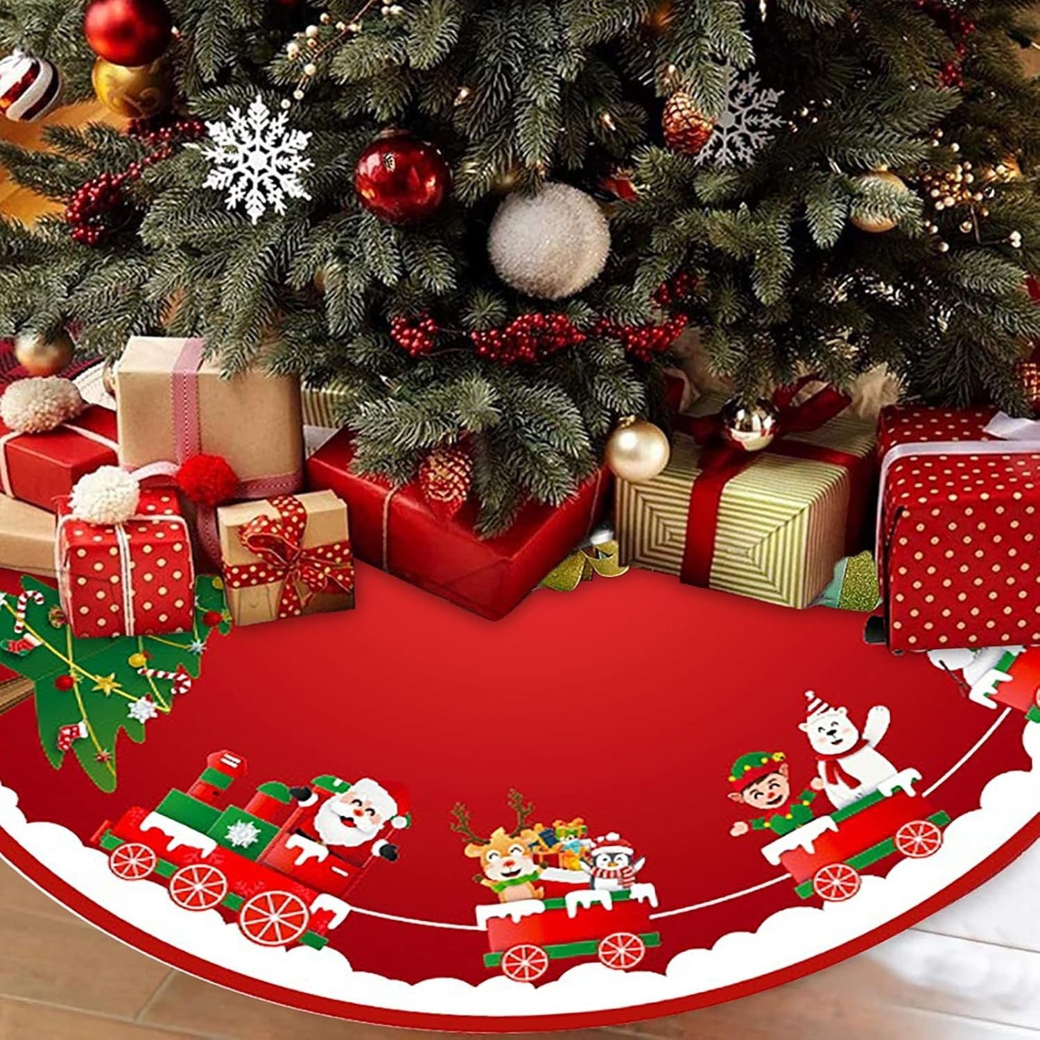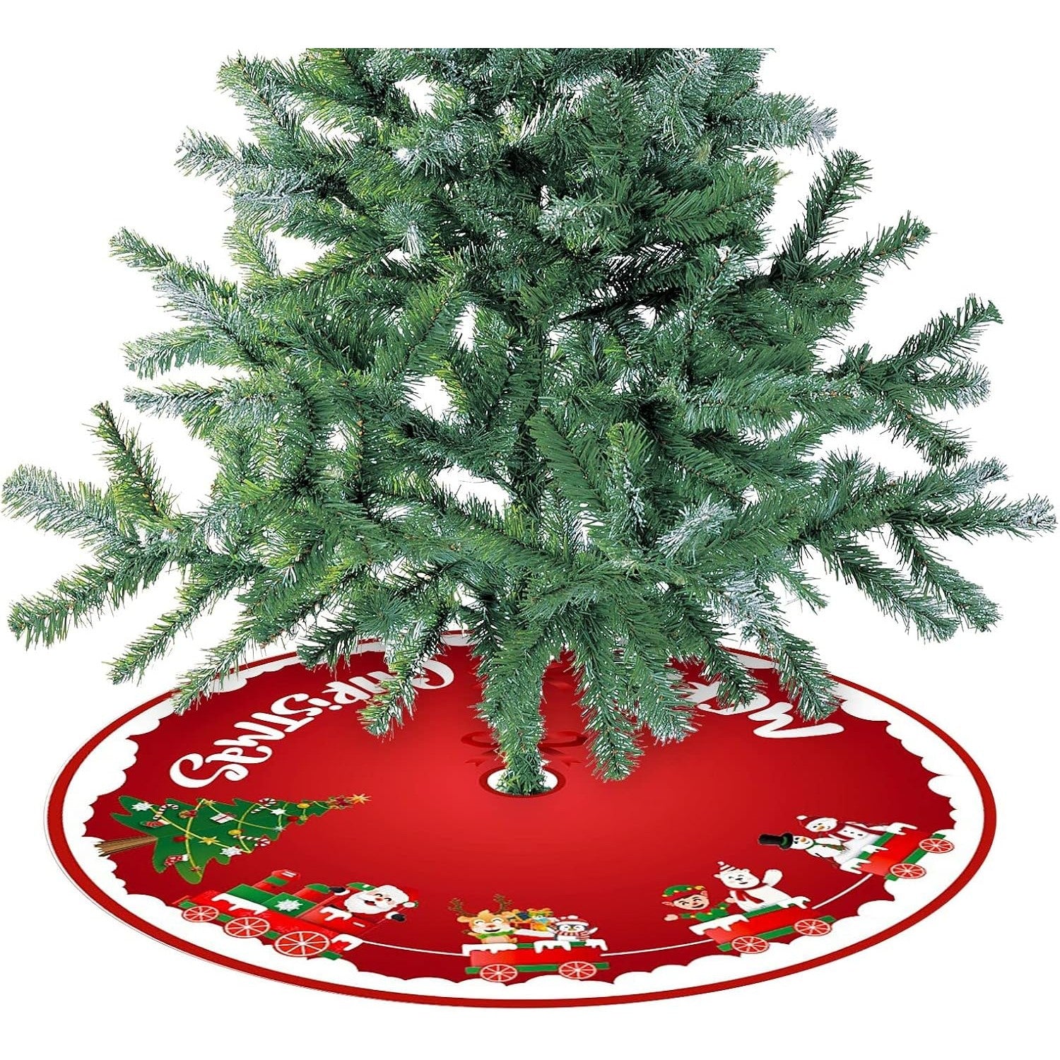 Covoras pentru Bradul de Craciun, din Tesatura Pufoasa, cu Fundite de Prindere, Model Sania lui Mos Craciun