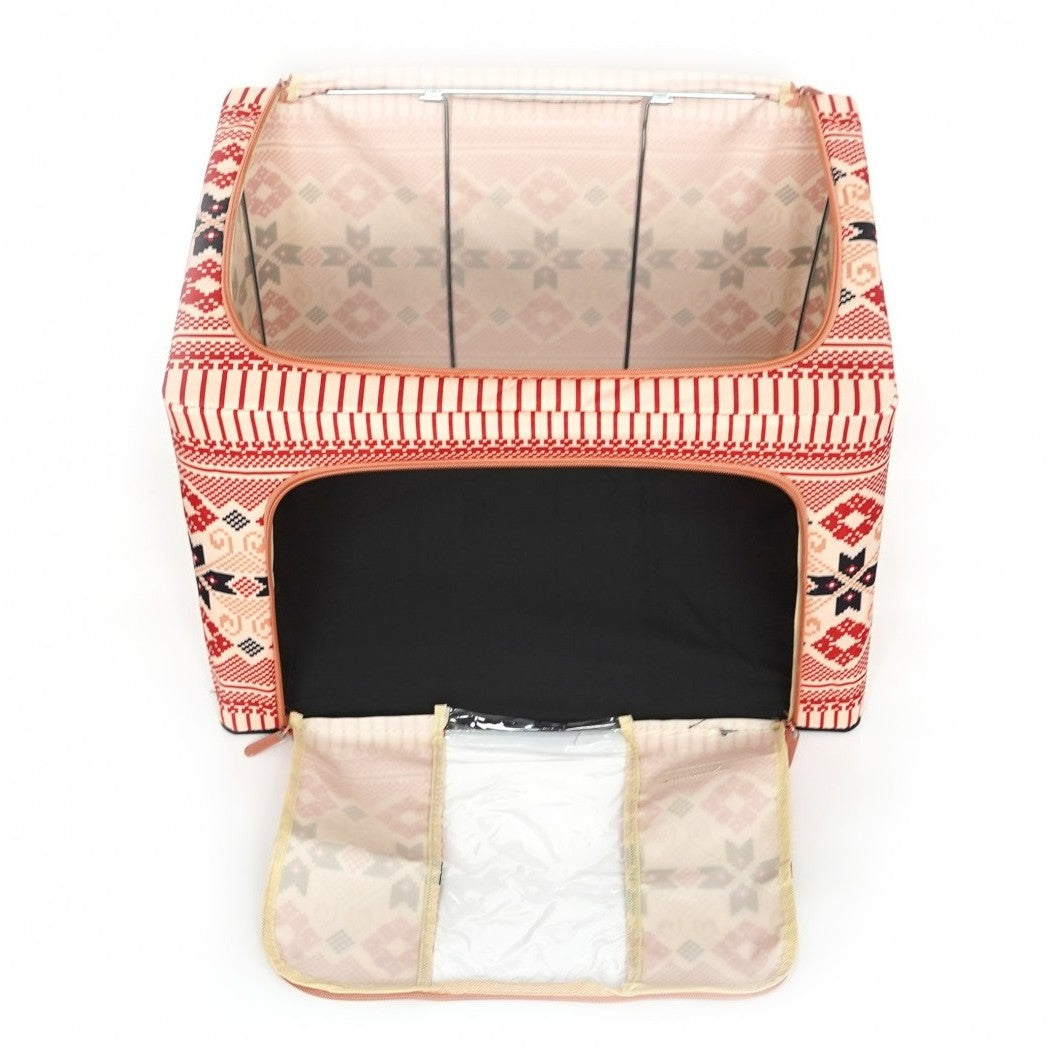 de Depozitare Pliabila, 66 L din Bumbac si In,Fereastra Frontala, 2 Usi de Acces cu Fermoar Bidirectional, Cadru Metalic, Suport Baza Stabil din Plastic, Motiv Traditional Model 5