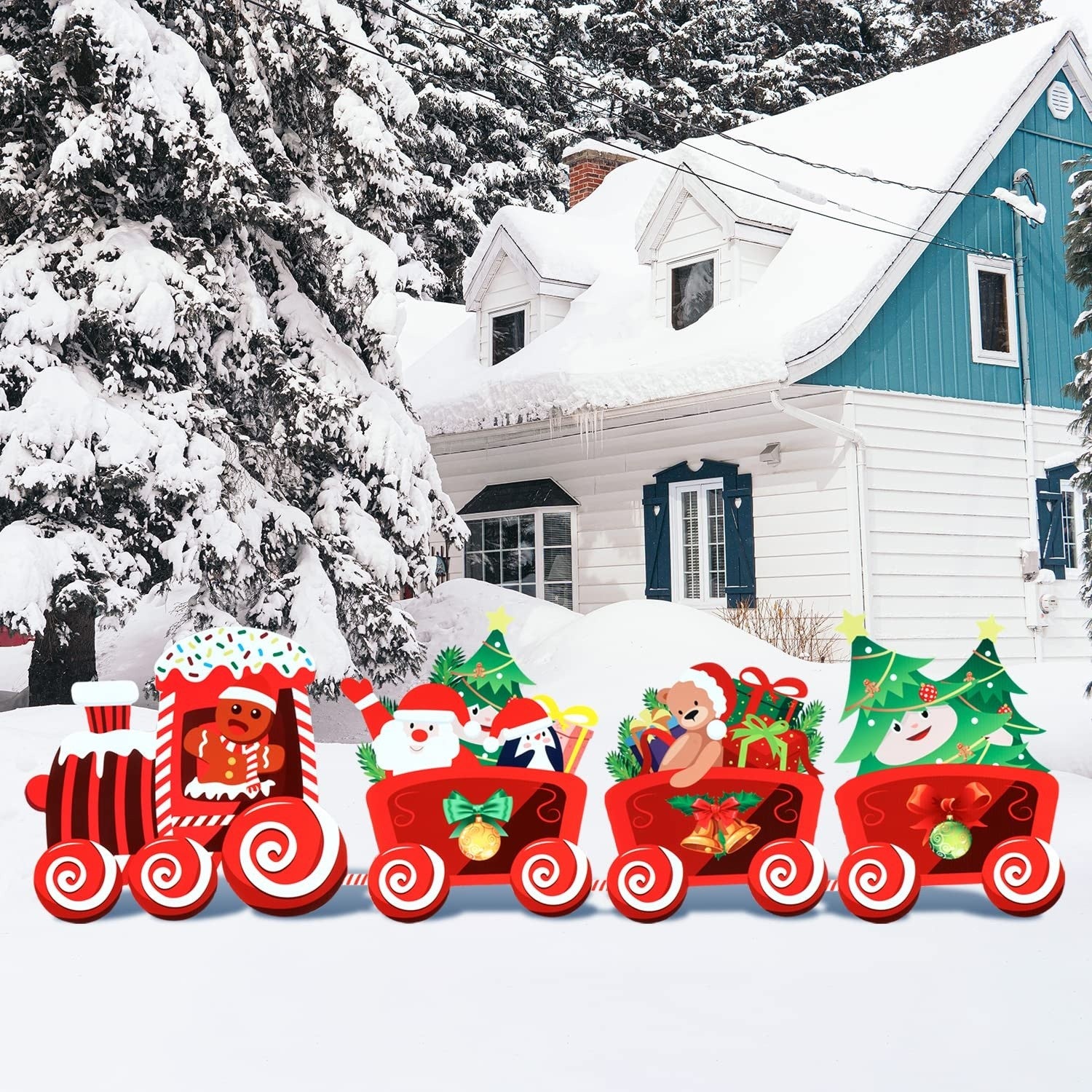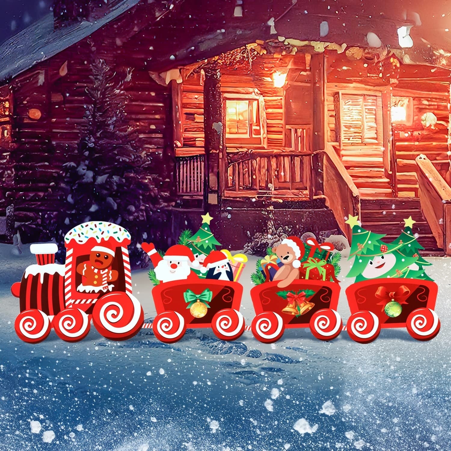 Decoratiune de Craciun, pentru Gradina, Tip Trenulet, 4 Figurine + Bete de Infipt in Pamant, din Plastic, Impermeabil, Model Tren cu Omul Briosa in Locomotiva