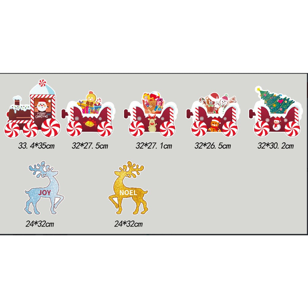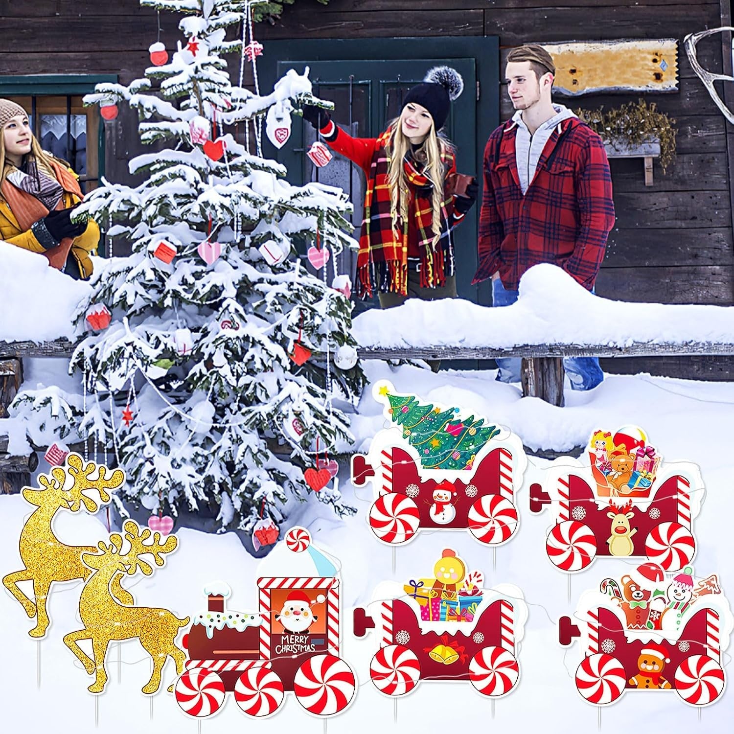 Decoratiune de Craciun, pentru Gradina, Tip Trenulet, 7 Figurine + Bete de Infipt in Pamant, din Plastic, Impermeabil, Model Renii Joy si Noel