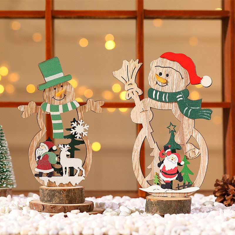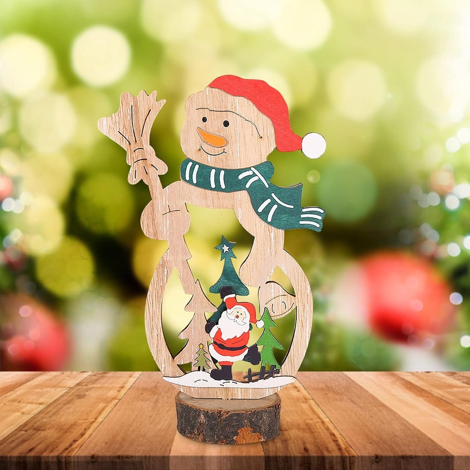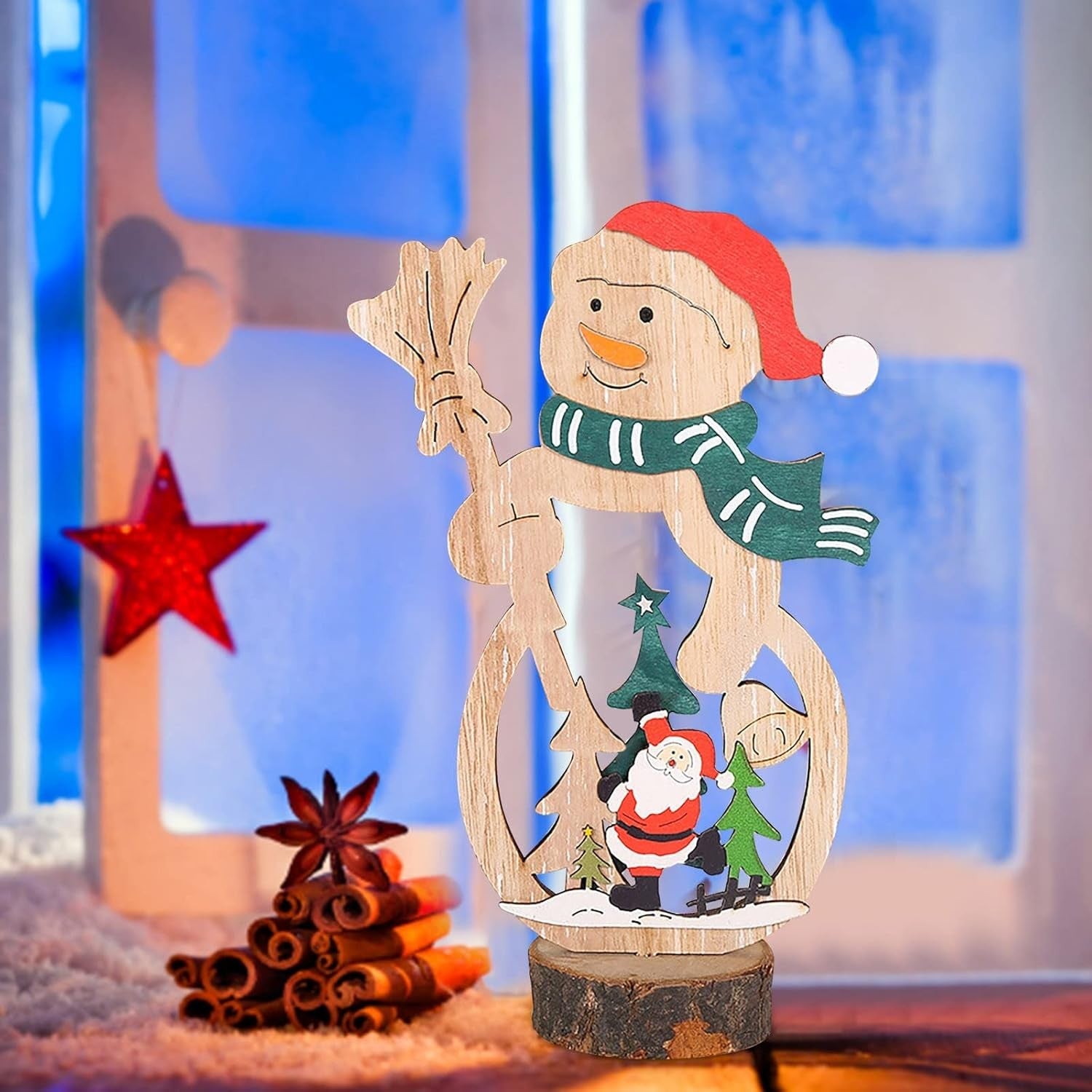 Decoratiune de Craciun, din Lemn,Model Om de Zapada cu Caciula Rosie