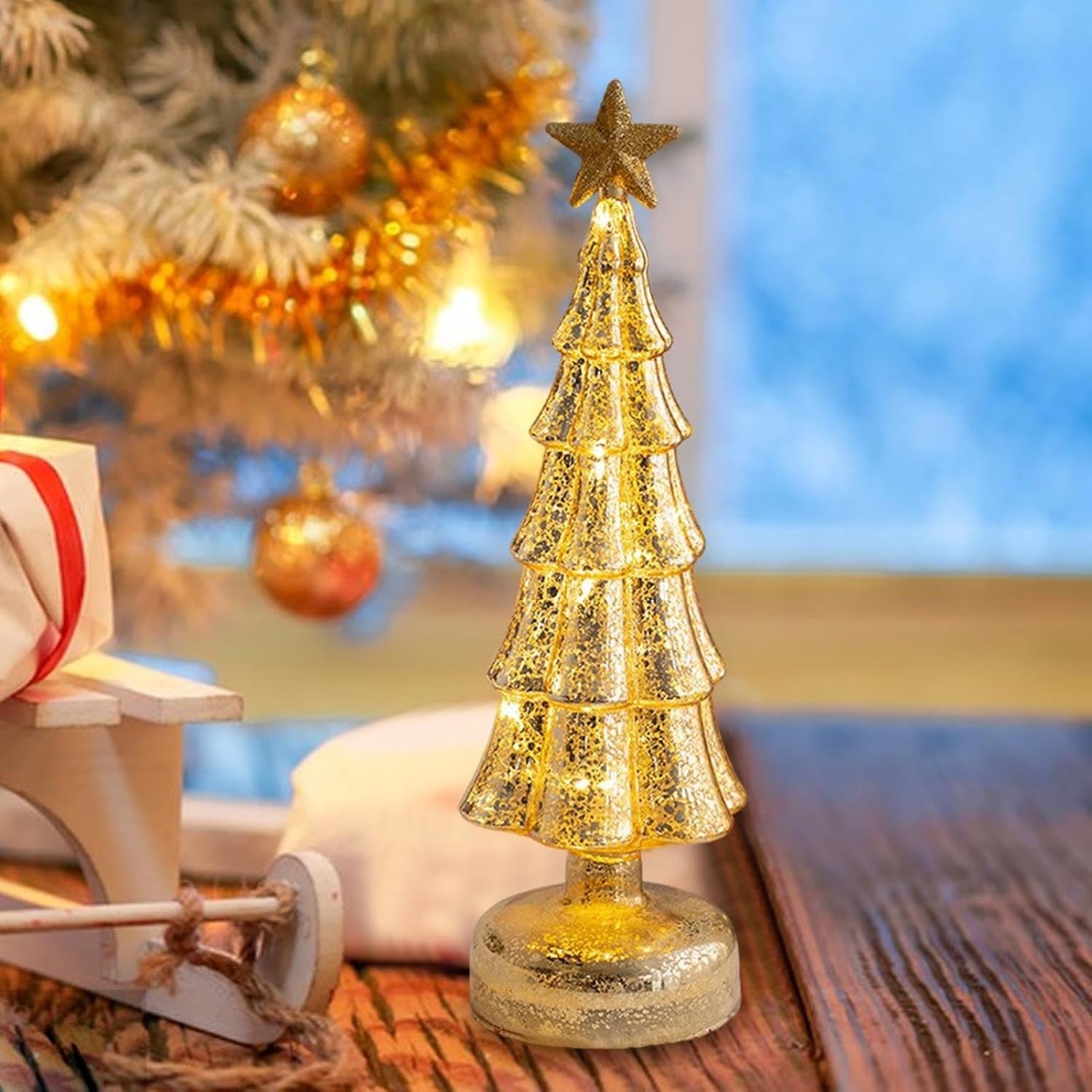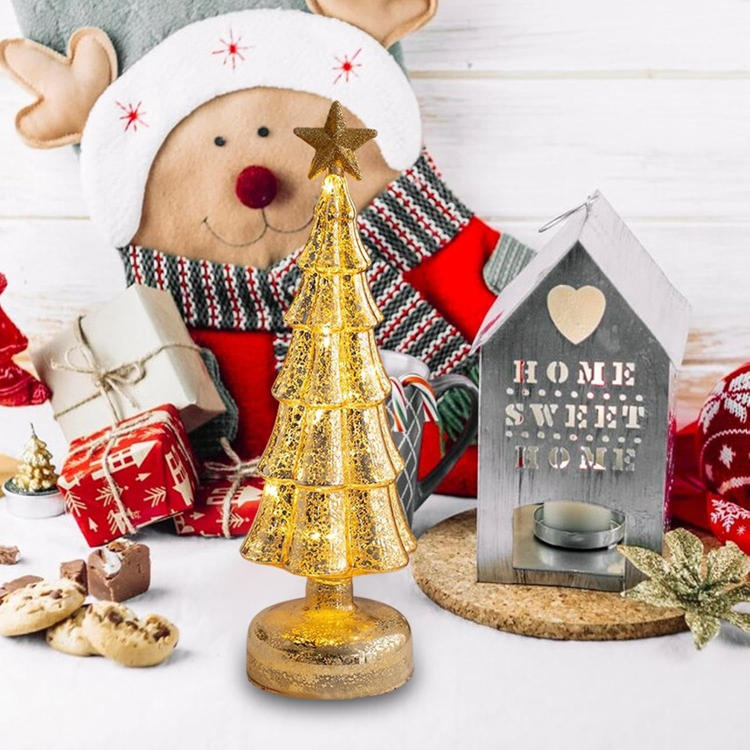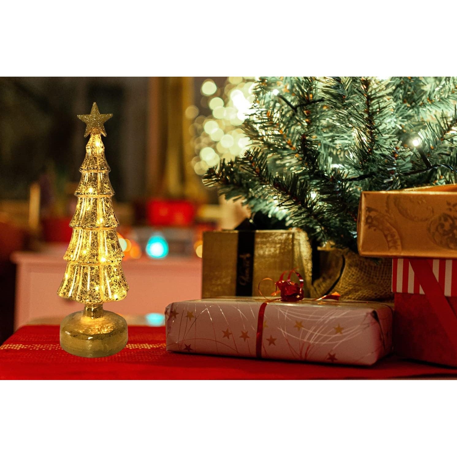 Decoratiune de Craciun, Model Brad cu Stea, din Sticla, Lumini, Baterii 3 AA