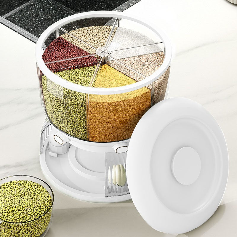 Dozator etajat de cereale rotativ 360, 6 compartimente, capacitate 10L, cofrag special pentru oua, vas pentru scurgerea cerealelor