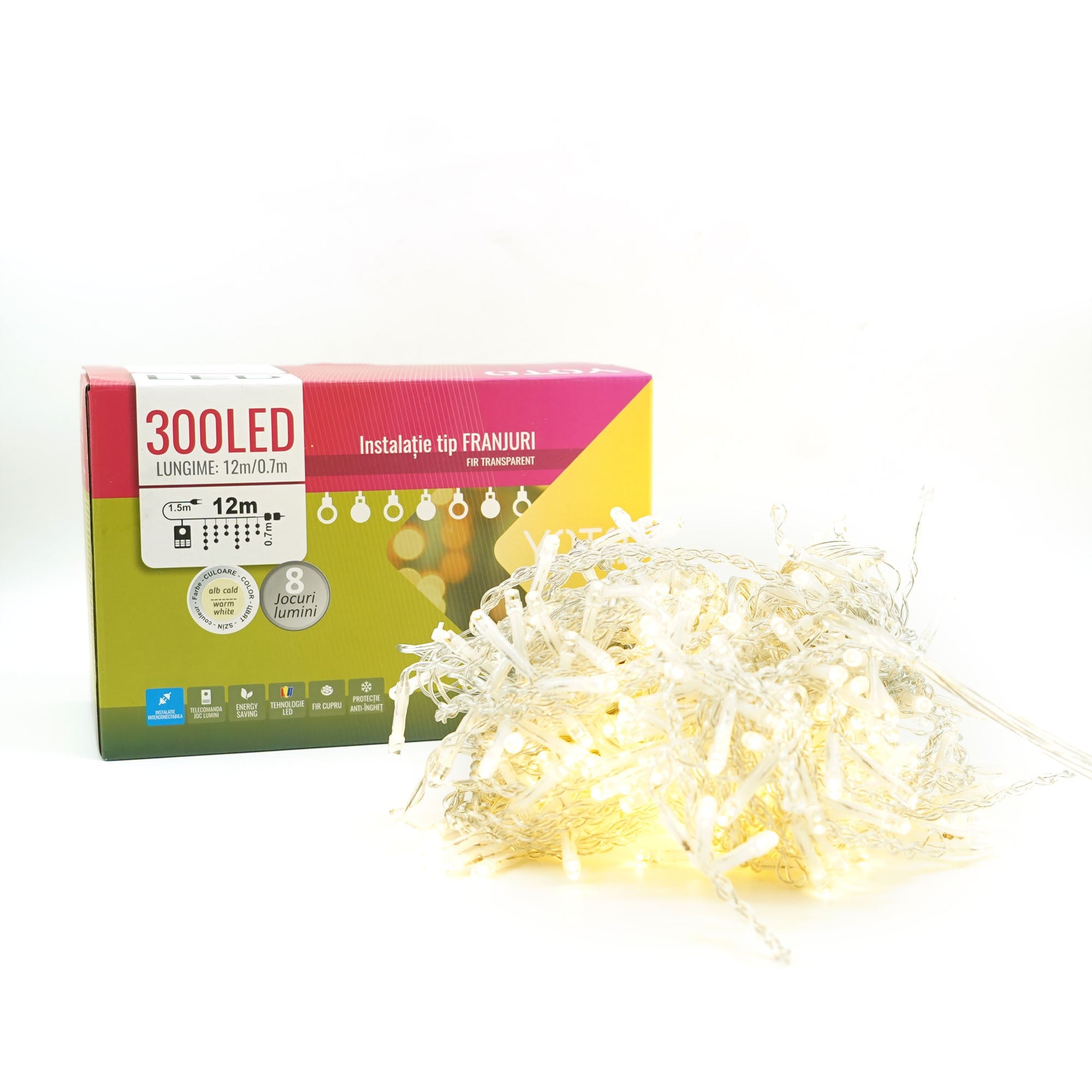 Instalatie Craciun Yoto, Tip Franjuri/Turturi,300 LED-uri, Prelungitor , 8 Jocuri de Lumini, Interconectabila, Conectare la Retea, Fir