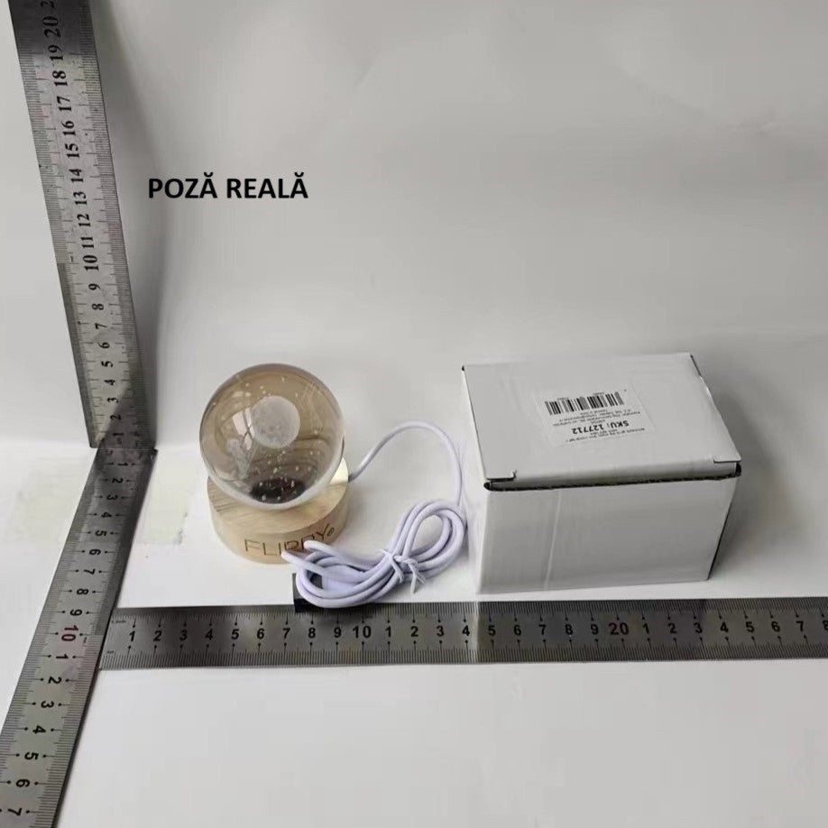Lampa LED Decorativa, cu Bila de Cristal cu Diametru , Model Astronaut pe Scara catre Luna 3D, Alimentare USB, Suport din Lemn, Lumina