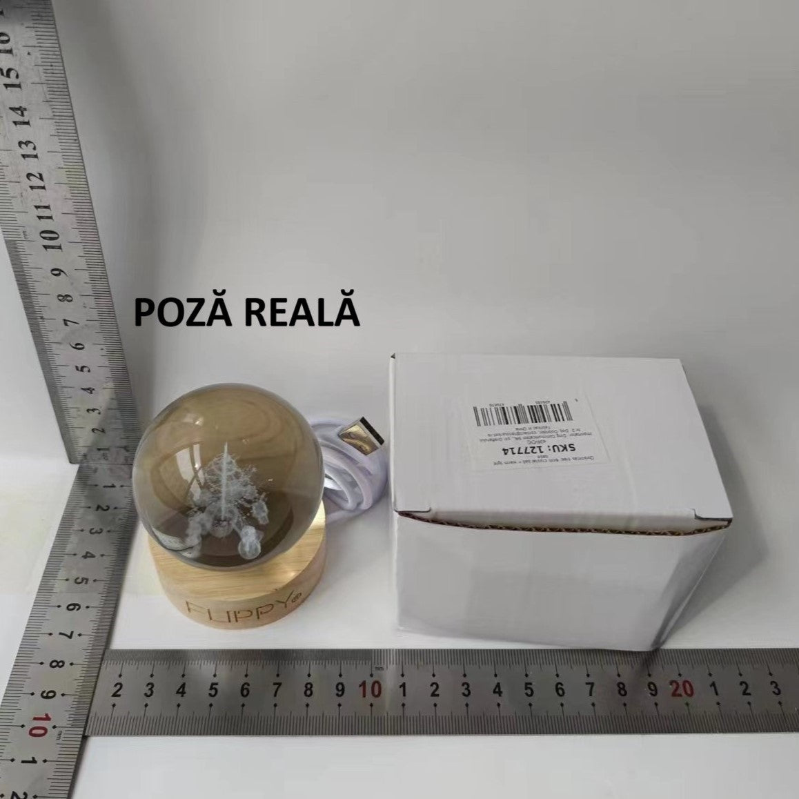 Lampa LED Decorativa, cu Bila de Cristal cu Diametru , Model Brad de Craciun 3D, Alimentare USB, Suport din Lemn, Lumina
