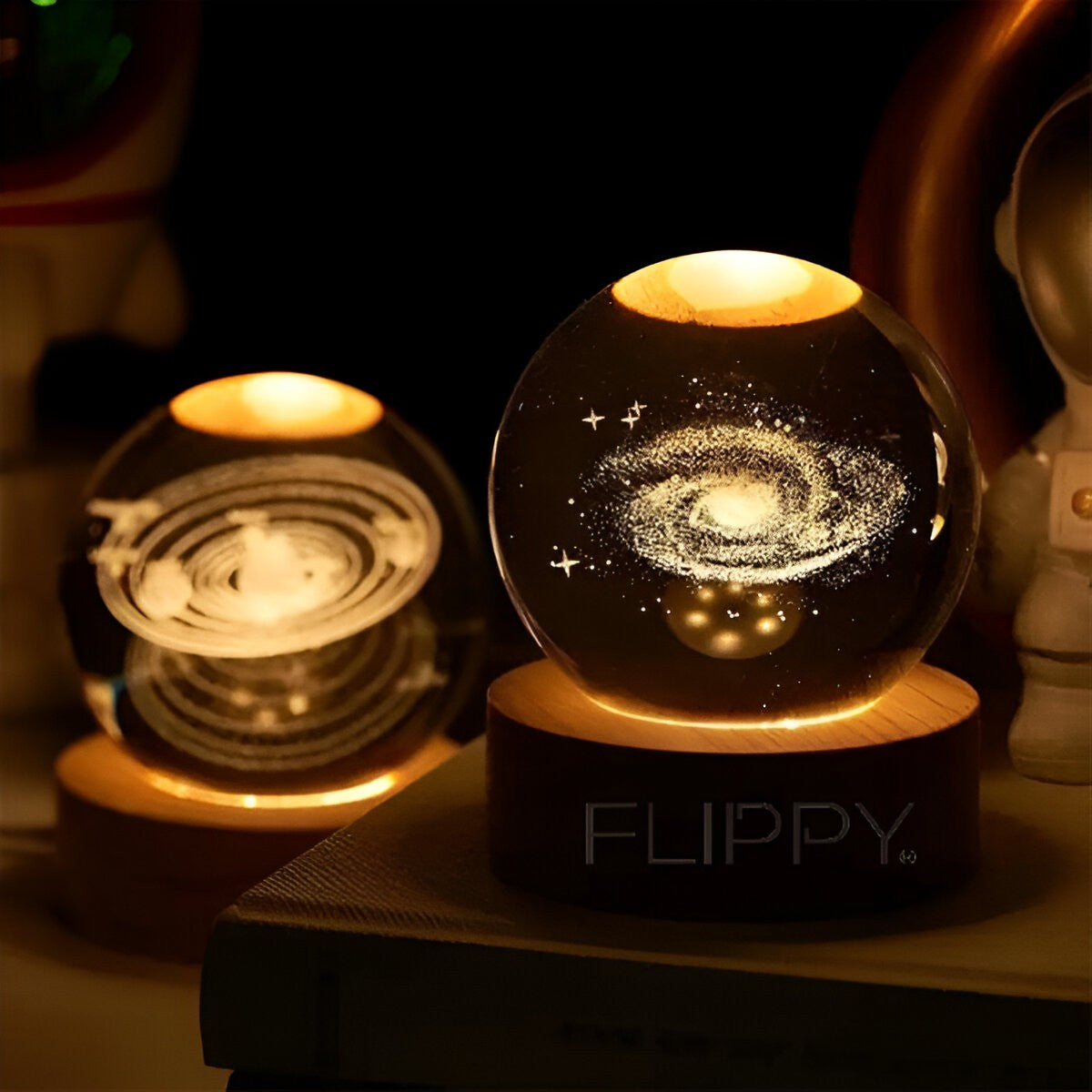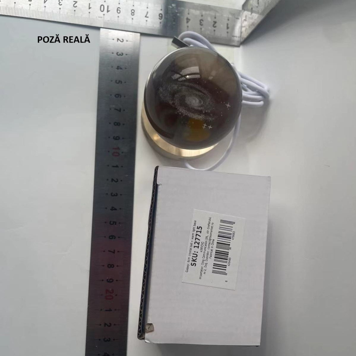 Lampa LED Decorativa, cu Bila de Cristal cu Diametru , Model Galaxie 3D, Alimentare USB, Suport din Lemn, Lumina