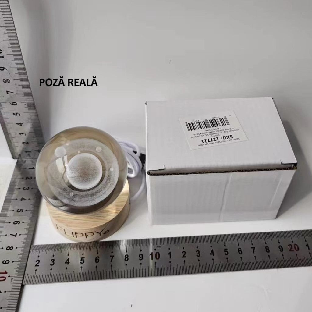 Lampa LED Decorativa, cu Bila de Cristal cu Diametru , Model Saturn 3D, Alimentare USB, Suport din Lemn, Lumina