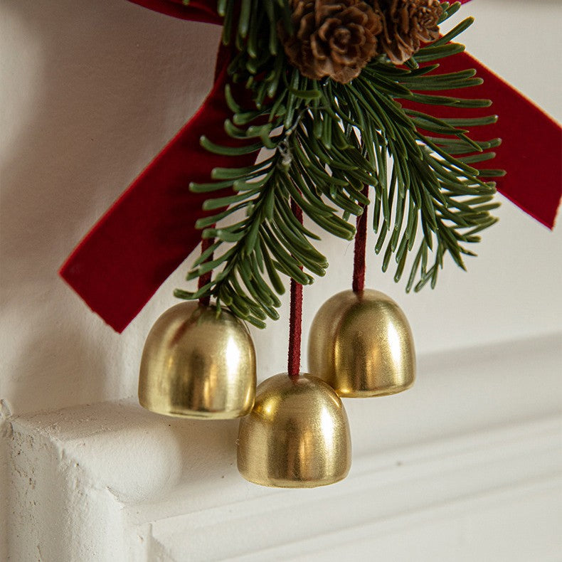 Ornament de Brad, tip Funda de Craciun cu 3 Clopotei Aurii si Conuri de Brad, Panglica Rosie de Velvet